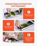 Features & Details Effortless Chopping and Storing: Equipped with stainless steel blades, sturdy and enduring, paired with a 40.58 fl oz / 1200mL large capacity storage container. Process more ingredients at once, reducing food prep time. Ideal for your vegetable chopper and food dicer needs Sharp Cutting: High-quality 420 stainless steel blades, sharp and enduring, easily cut through various ingredients. Avoids food sticking, making your prep with a veggie chopper efficient and smooth Dicing and Chopping: Comes with three blade sizes—Small Dicer 0.2 inch, Medium Dicer 0.47 inch, and Large Dicer 0.71 inch. Effortlessly create evenly diced ingredients, ideal for salads, stews, stir-fries, and more, with your food chopper 3-Step Easy Chopping: Fast and efficient prep—place the blade on the chopping board, press it until fixed, add the ingredients, and press again. Complete your food dicer work with ease in three simple steps Dishwasher Secure: The vegetable cutter includes a blade cleaning fork for easy cleaning and can be placed in the dishwasher for easy washing, reducing the hassle of maintenance for your vegetable chopper